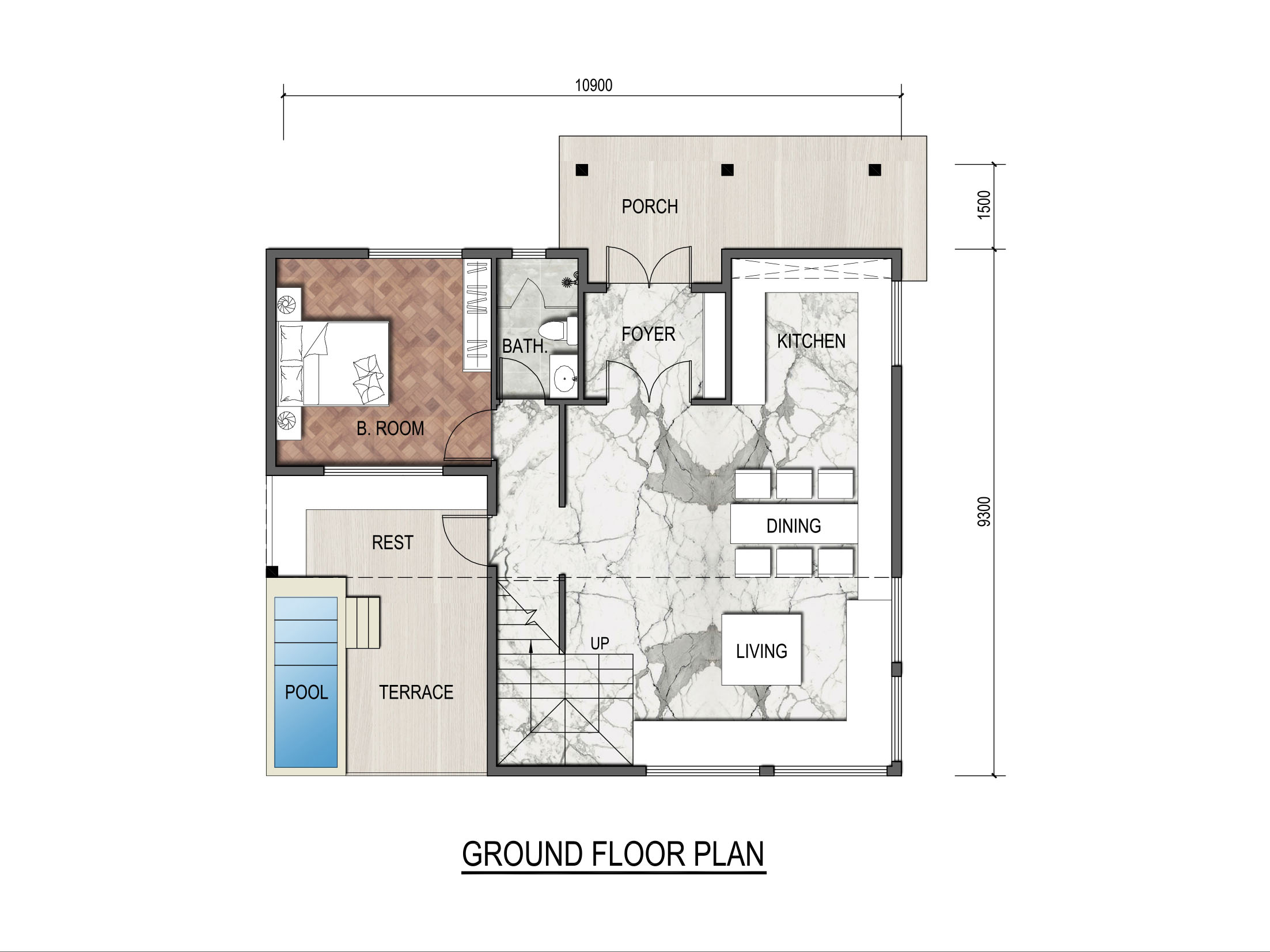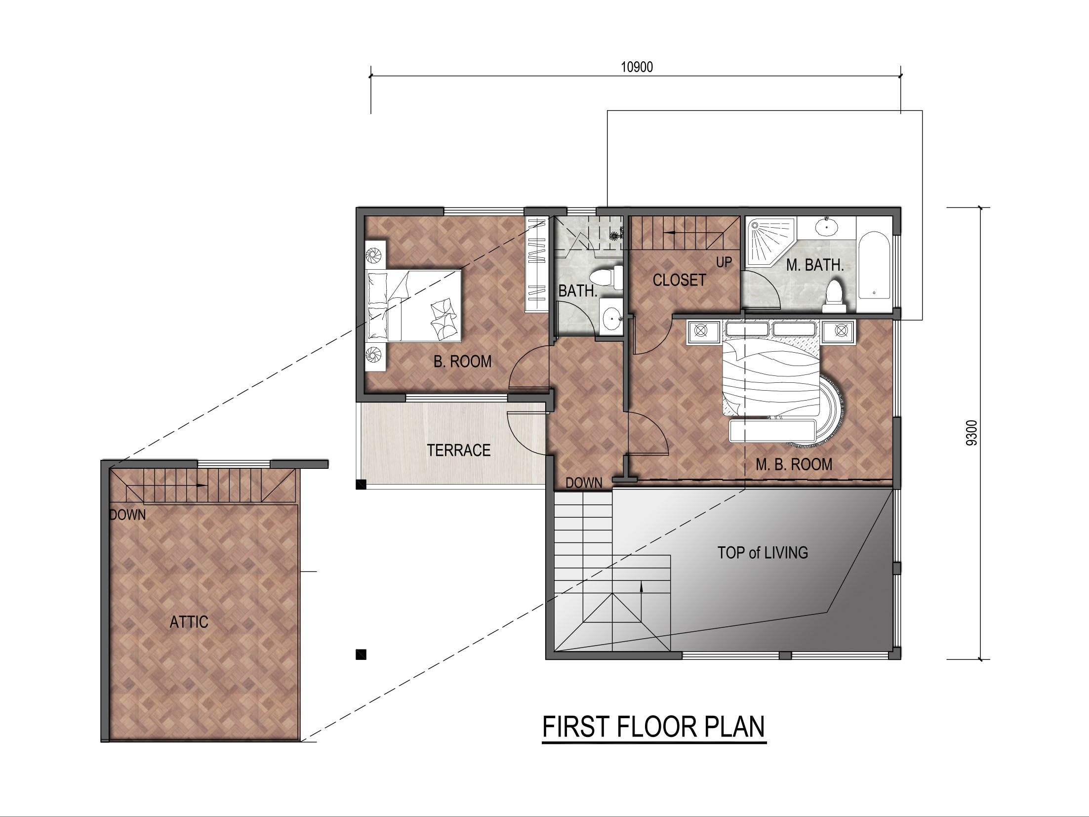PLAN 6447 的基本信息 尺寸 寬 10.9m 深度 9.3m 面積(㎡) 1樓 83㎡ 占地面積 83㎡ 總建筑面積 165㎡ 高度(m) 1樓 3.0m 總高度 10.0m 每戶 樓層 X2 臥室 X3 客廳 X1 浴室 X3 露臺(tái) X2 車庫 X0 閣樓 X1